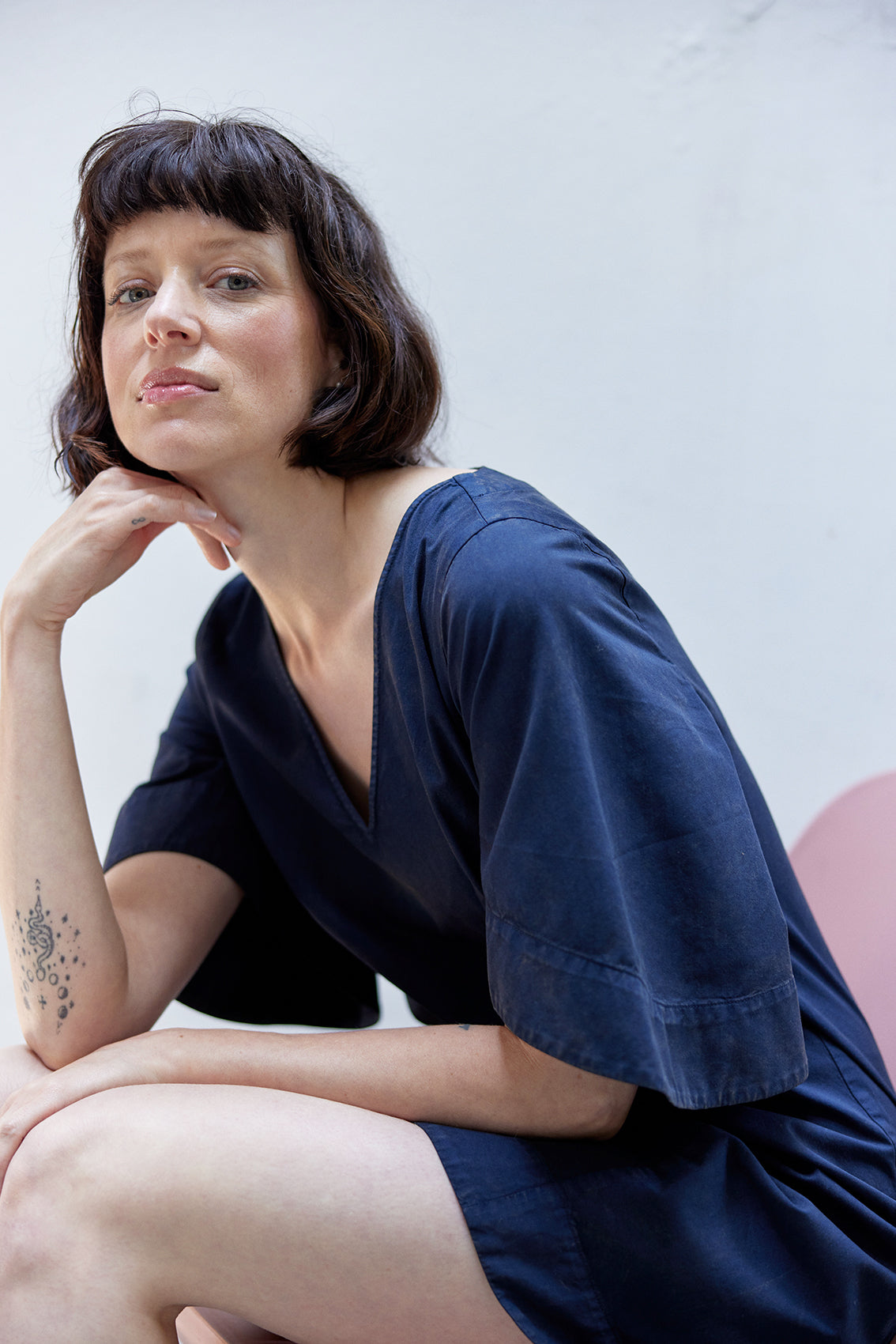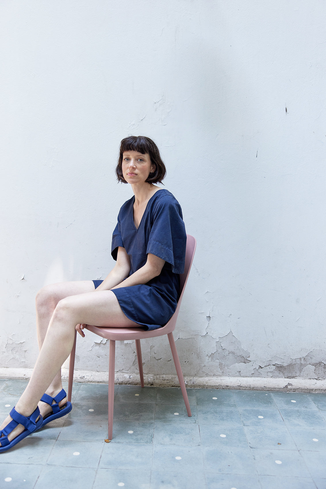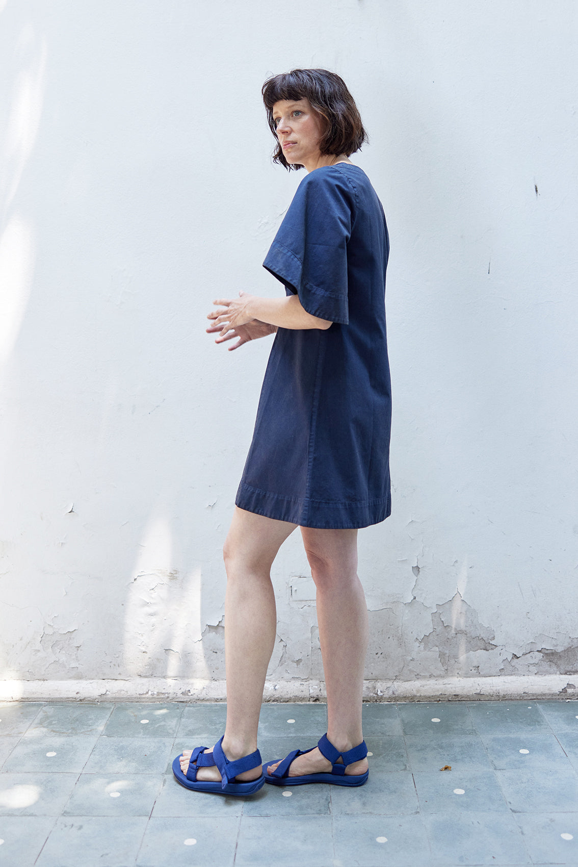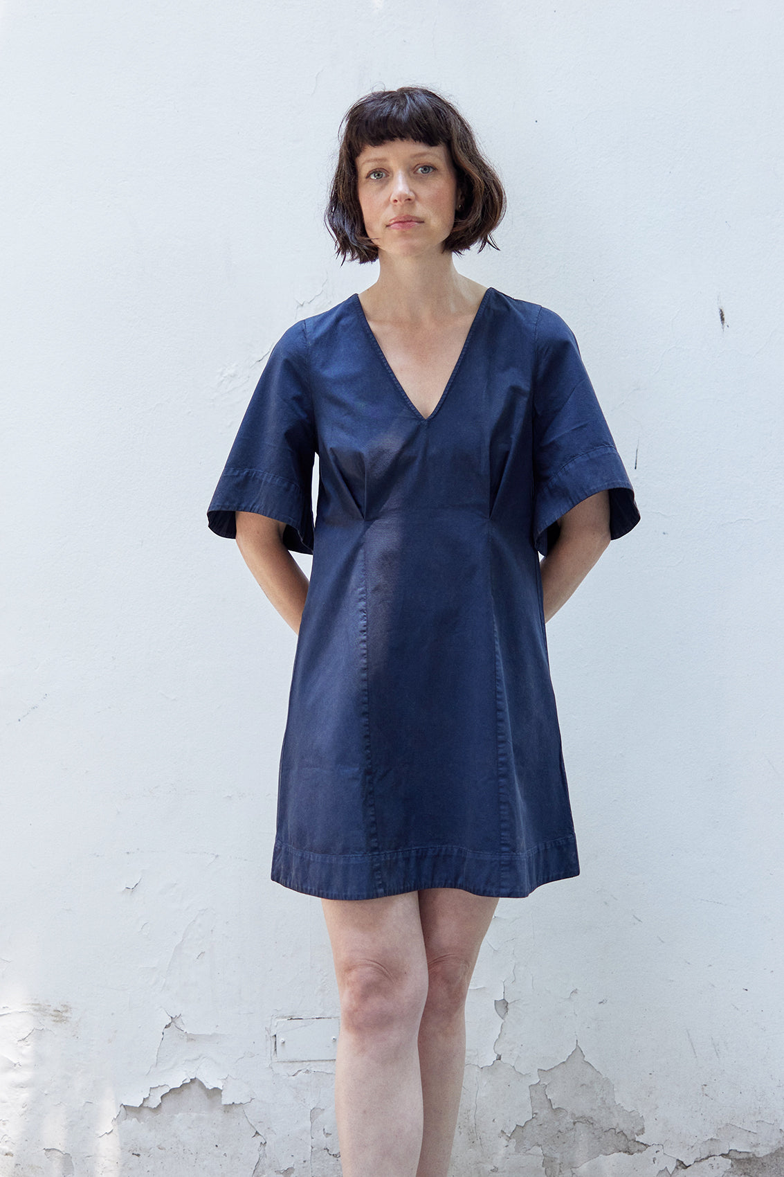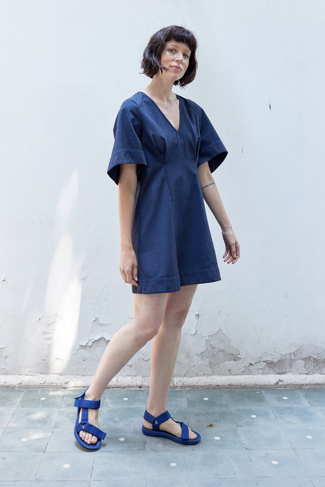 Washed Ample Sleeves V-Neck Short Dress Cotton - Lago