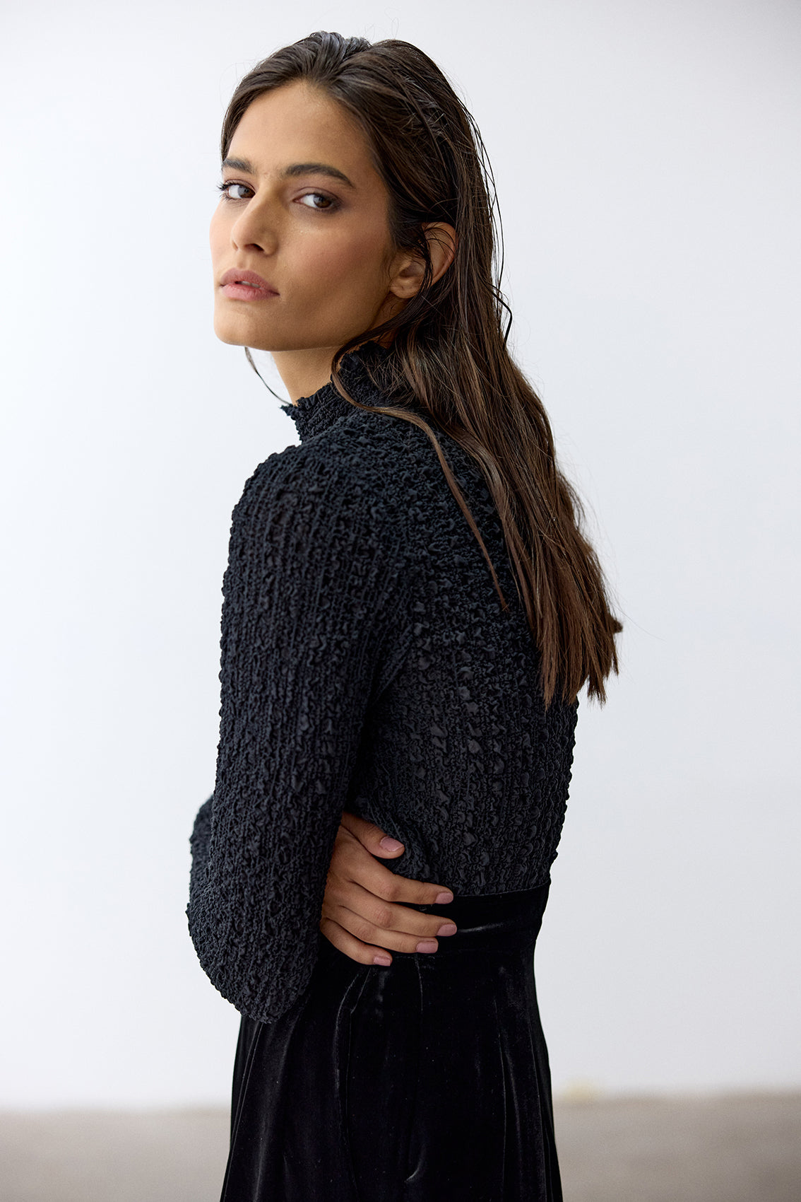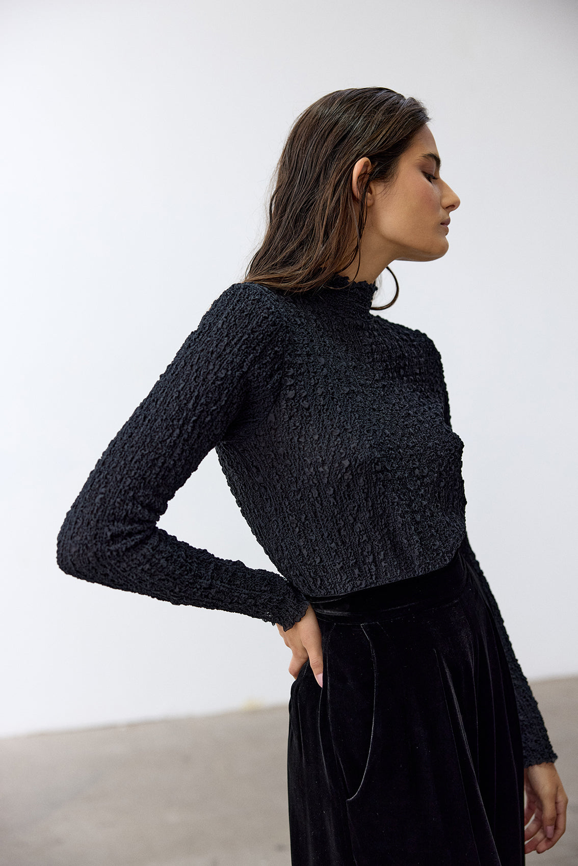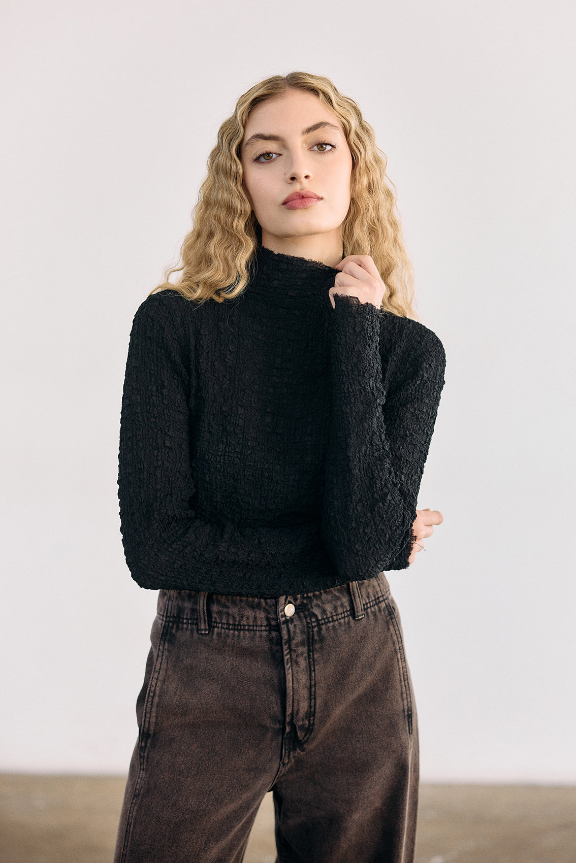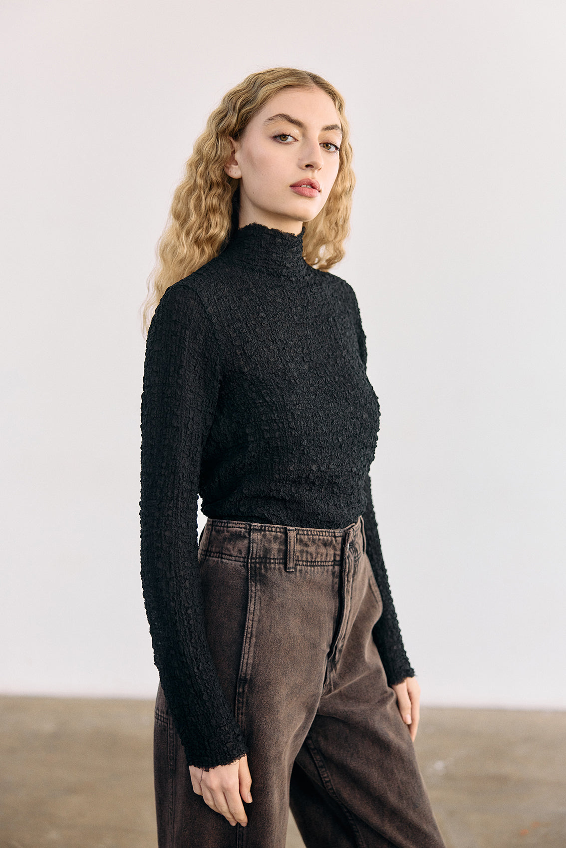 Crinkle Texture Silk Turtleneck Top - Ónix